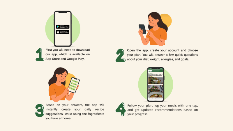 Did you ever tried to eat healthy but felt completely overwhelmed? Not enough time, too many diets and no idea what to cook? Our app turns that chaos into something simple and enjoyable. You will get personalised recipes, tailored to your lifestyle, in just four simple steps.